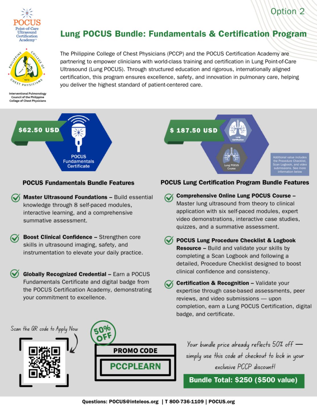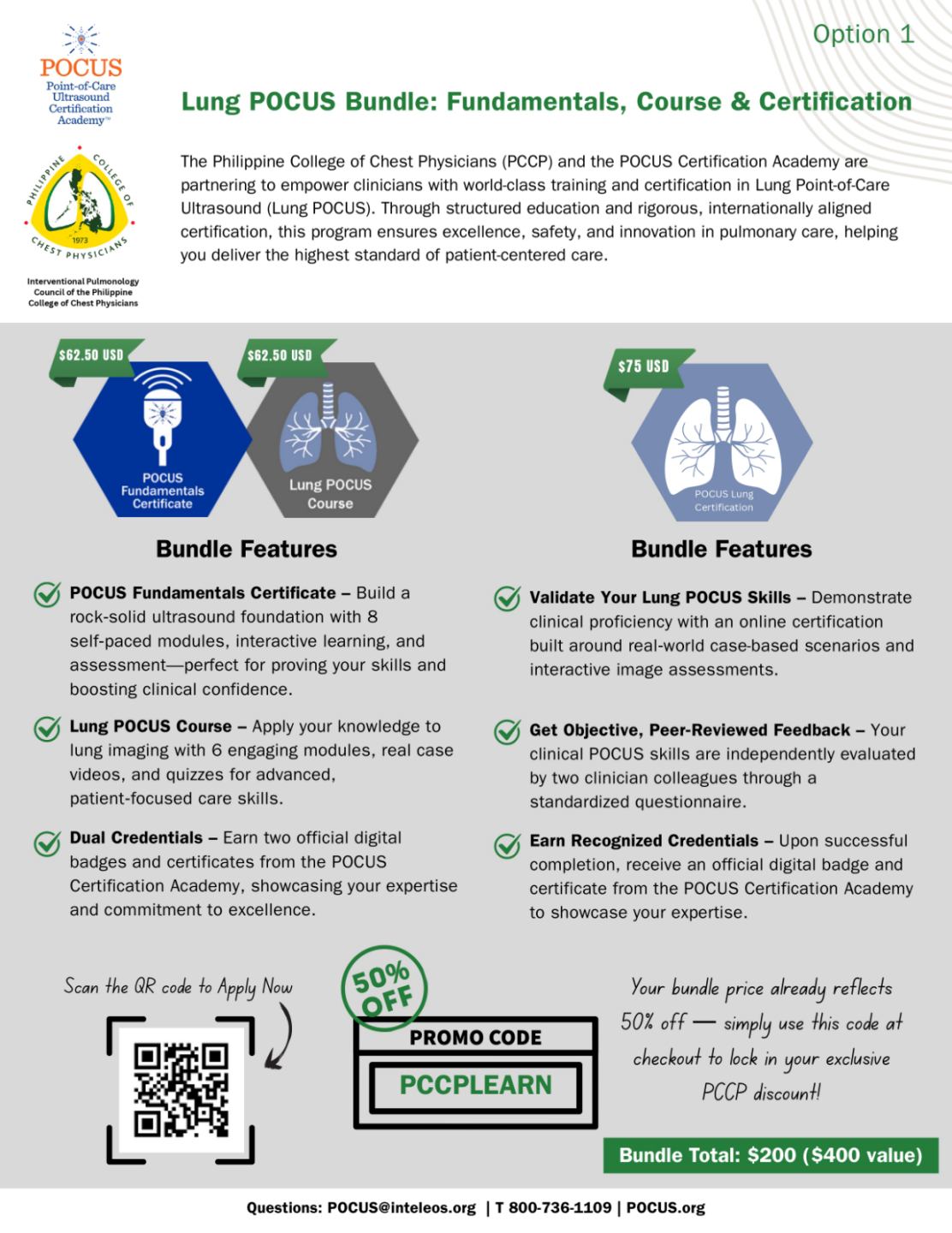 The Philippine College of Chest Physicians (PCCP) and the POCUS Certification Academy are partnering to empower clinicians with world-class training and certification in Lung Point-of-Care Ultrasound (Lung POCUS). Through structured education and rigorous, internationally aligned certification, this program ensures excellence, safety, and innovation in pulmonary care, helping you deliver the highest standard of patient-centered care.