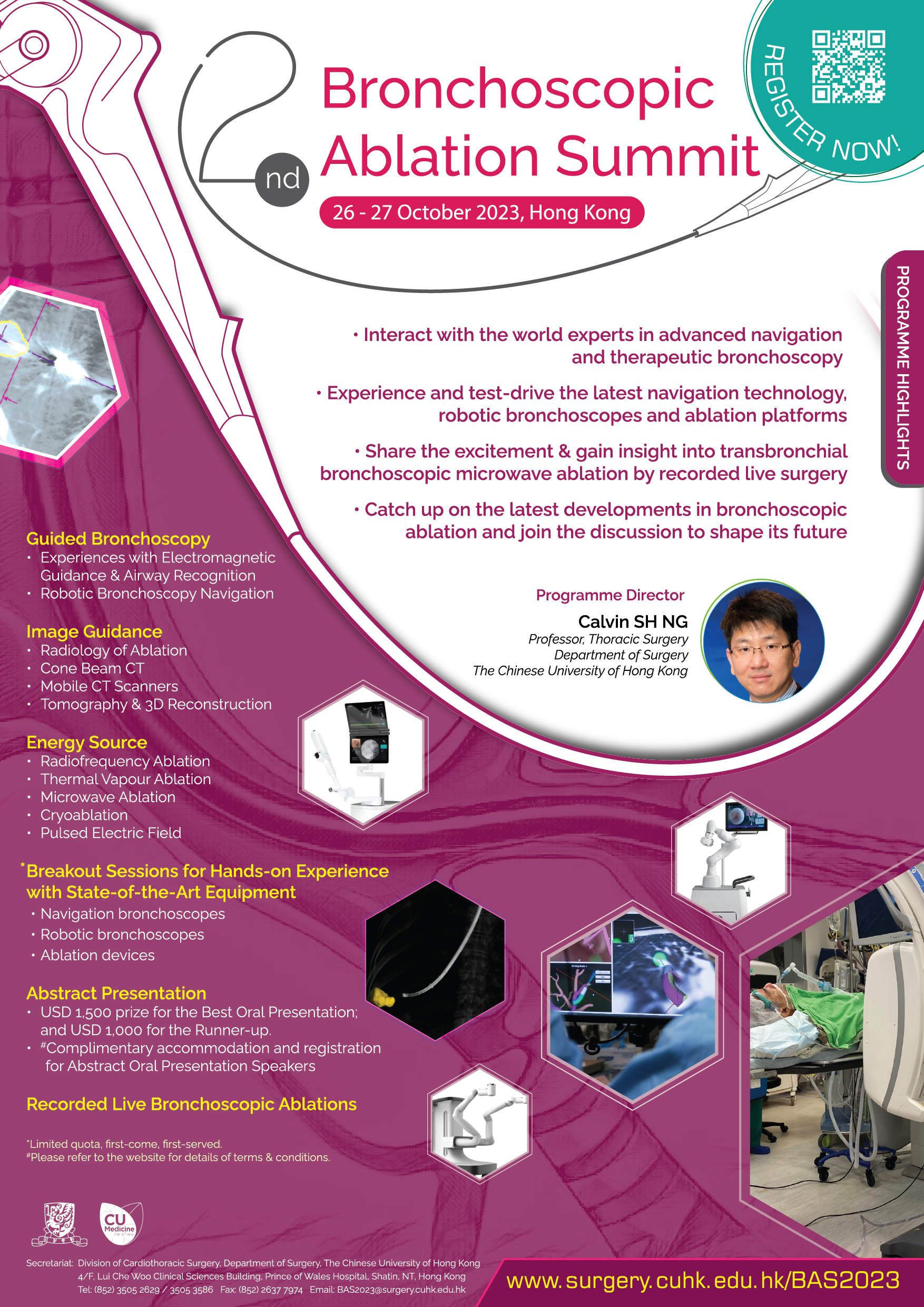 "2nd Bronchoscopic Ablation Summit” (BAS 2023), organized by the Division of Cardiothoracic Surgery, Department of Surgery, The Chinese University of Hong Kong, will take place in Hong Kong on 26th – 27th October, 2023.