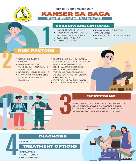 The Council on Lung Malignancy is dedicated to advancing the fight against lung cancer in the Philippines. This Council focuses intensely on early detection through screening for those with significant risk factors and raising public awareness through education campaigns and lay forums. Our advocacy efforts extend beyond embracing the emotional and social well-being of those affected by the disease. We strive to create an environment of comfort, inspiration and a strong sense of community for both lung cancer patients and their dedicated caregivers. Another deliverable of the council is to develop and establish a comprehensive lung cancer registry which aims to provide a detailed database focusing on the demographic and clinical data of Filipinos diagnosed with lung cancer. This registry can also serve as a reference for researchers enabling studies on the impact of different therapies, treatment outcomes and the identification of areas needing further research. Another target of the council, along with other medical societies, is to launch the PhilHealth Expansion of Lung Cancer Care Services, which aims to provide responsive benefit packages and continuously improve services for lung cancer patients.