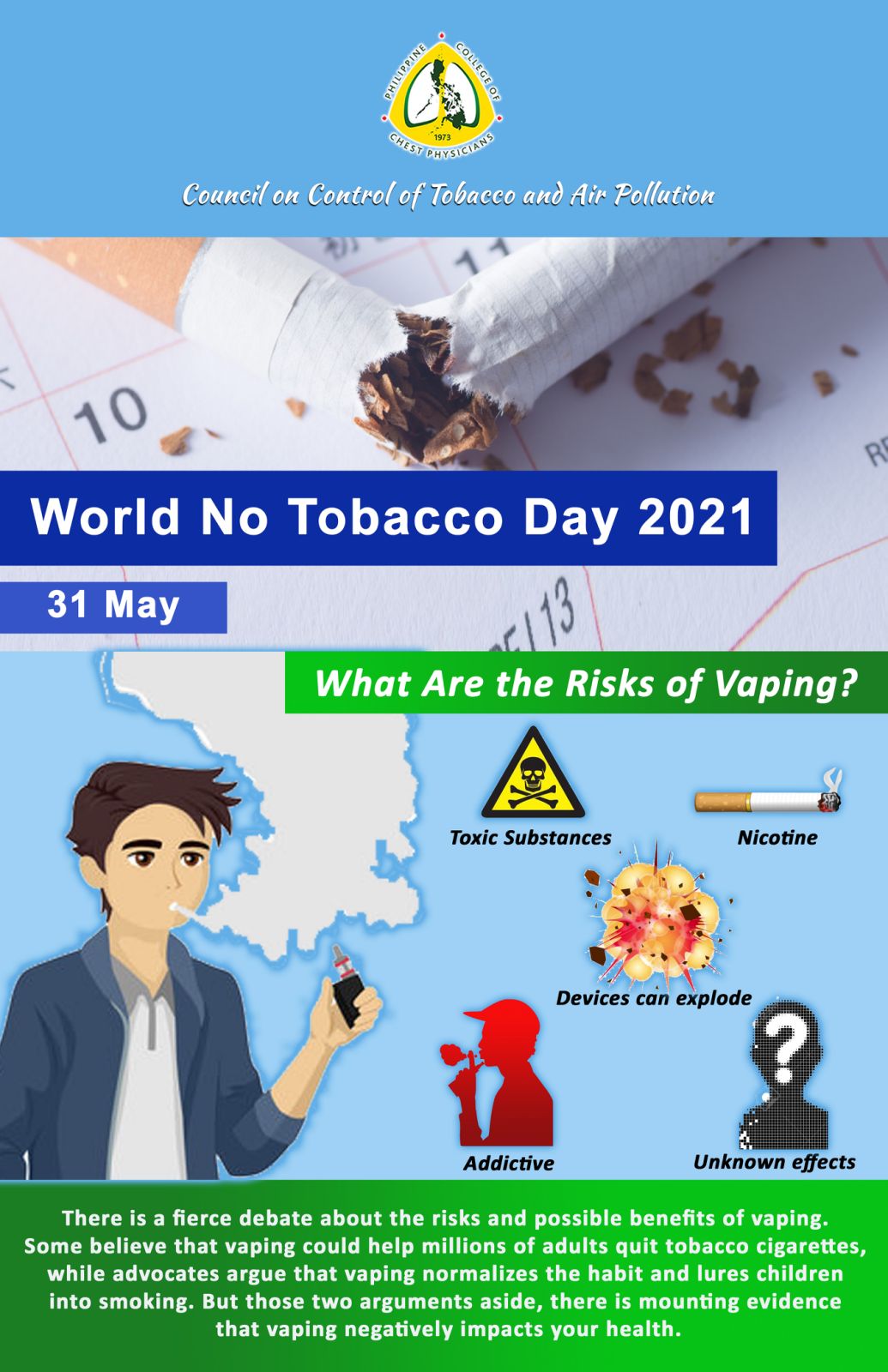 Watch as Dr. Dexter Feliciano, member of the Council on Control of Tobacco and Air Pollution, discusses the bad effects of smoking in celebration of the world no tobacco day.